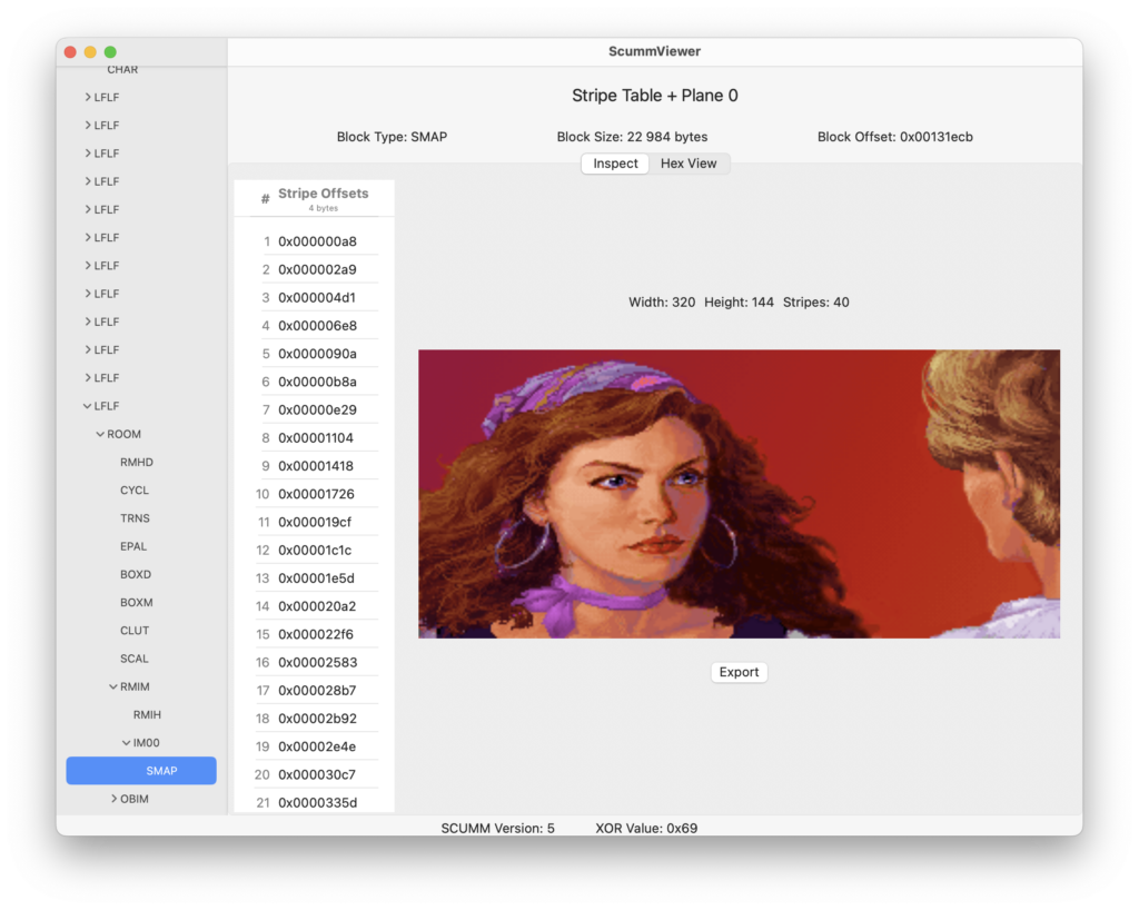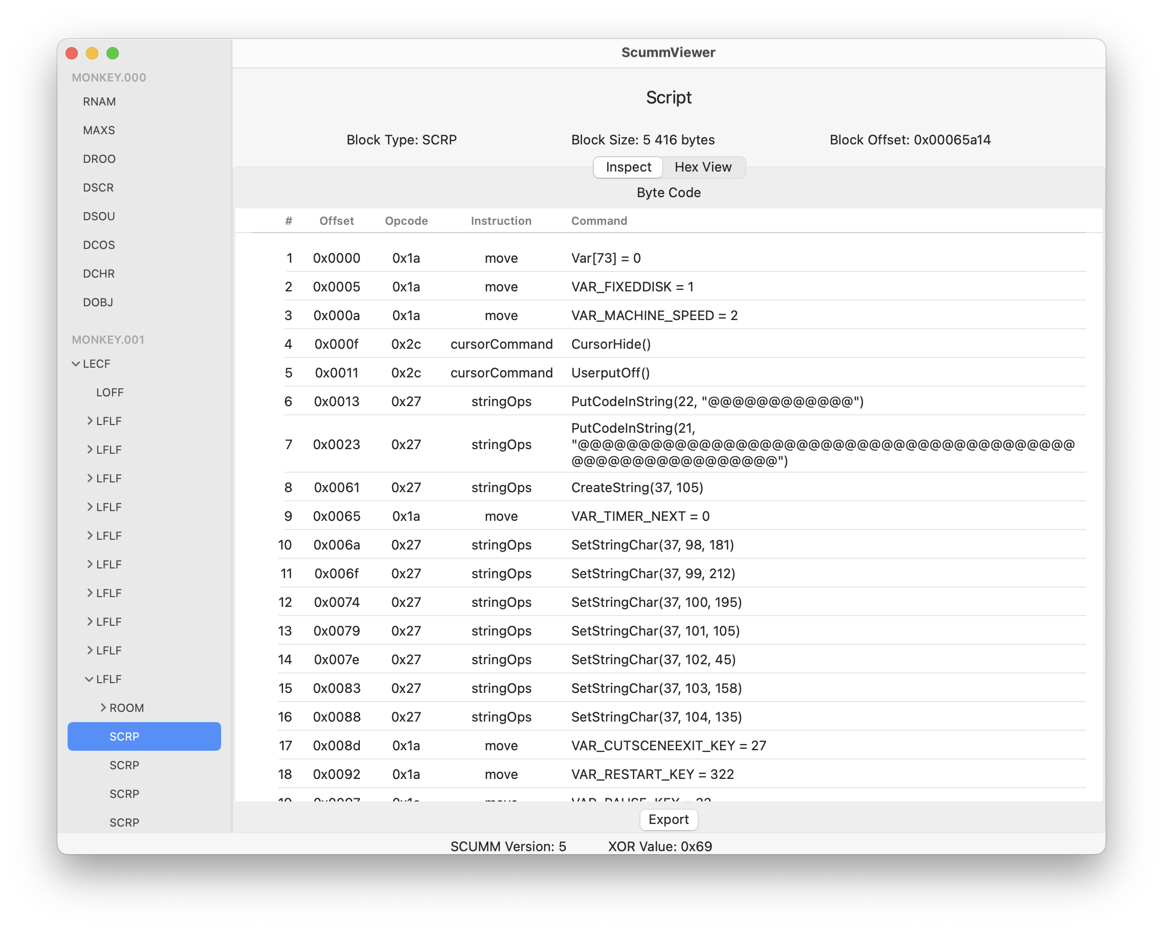 - Inspect resources (rooms, boxes, charsets, costumes, images, objects, scripts, sounds)